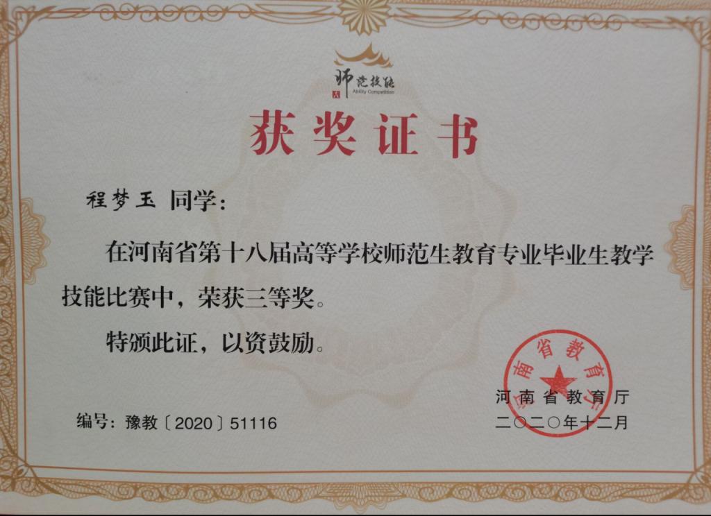 程梦玉-河南省第十八届高等学校师范生教育专业毕业生教学技能比赛三等奖