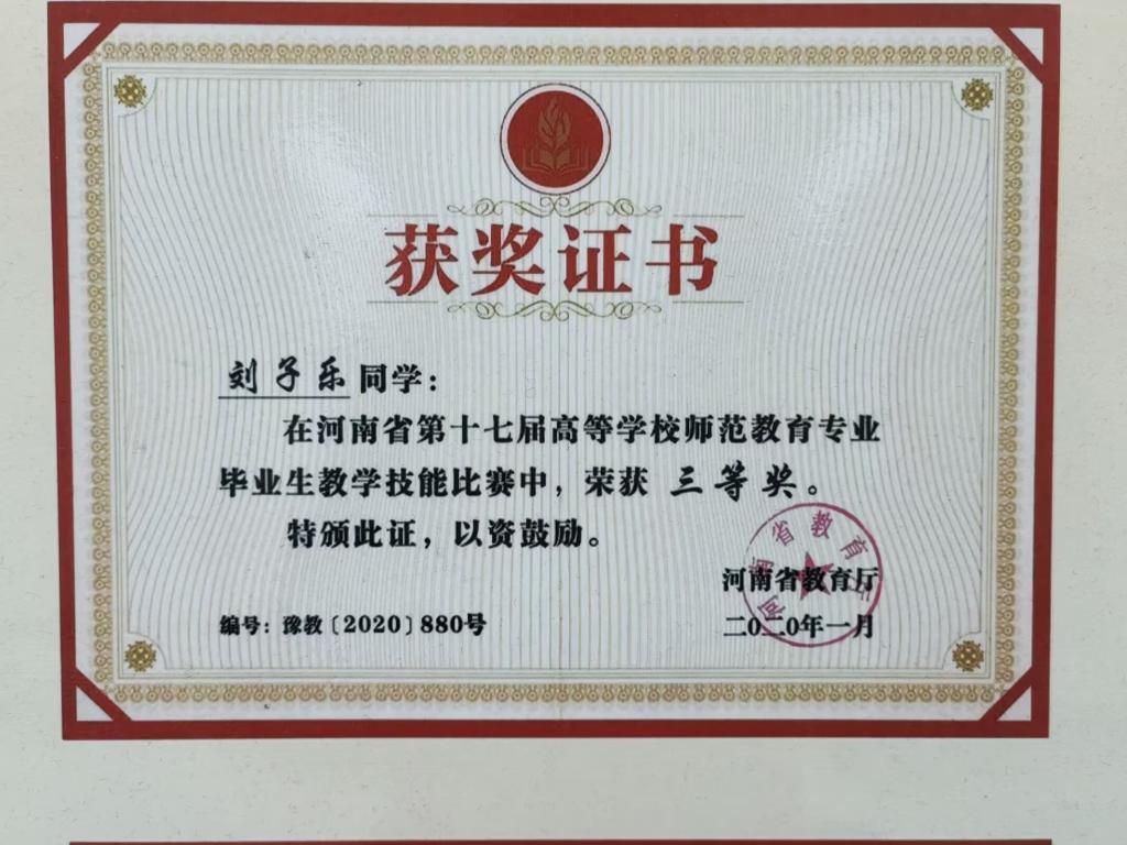 刘子乐-河南省第十七届高等学校师范教育专业毕业生教学技能比赛三等奖