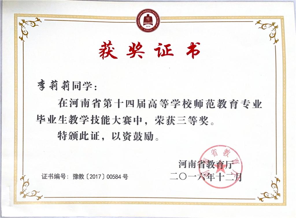 李莉莉-河南省第十四届高等学校师范教育专业毕业生教学技能比赛荣获三等奖
