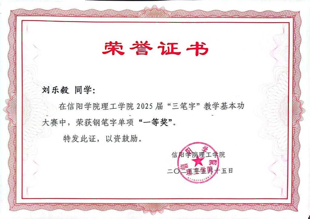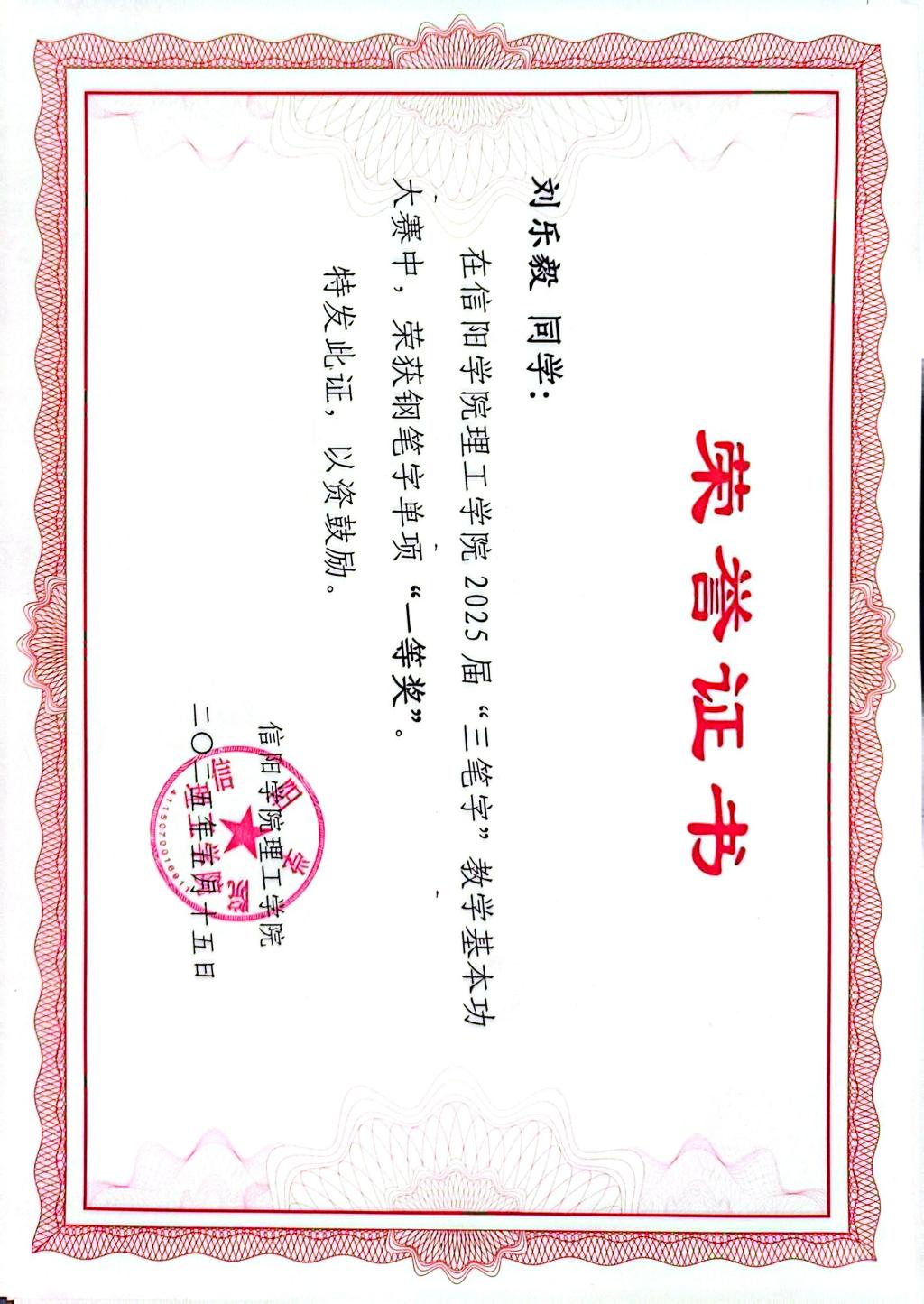 刘乐毅-信阳学院理工学院2025届“三笔字”教学基本功大赛荣获钢笔字单项一等奖